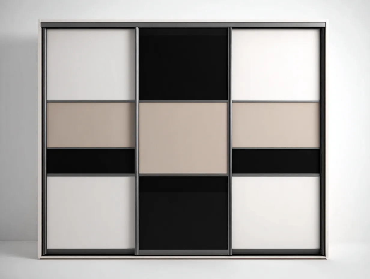 Amplio armario con tres puertas correderas en colores blanco, negro y beige, diseñado para optimizar el espacio de almacenamiento en dormitorios y aportar un estilo moderno y elegante.