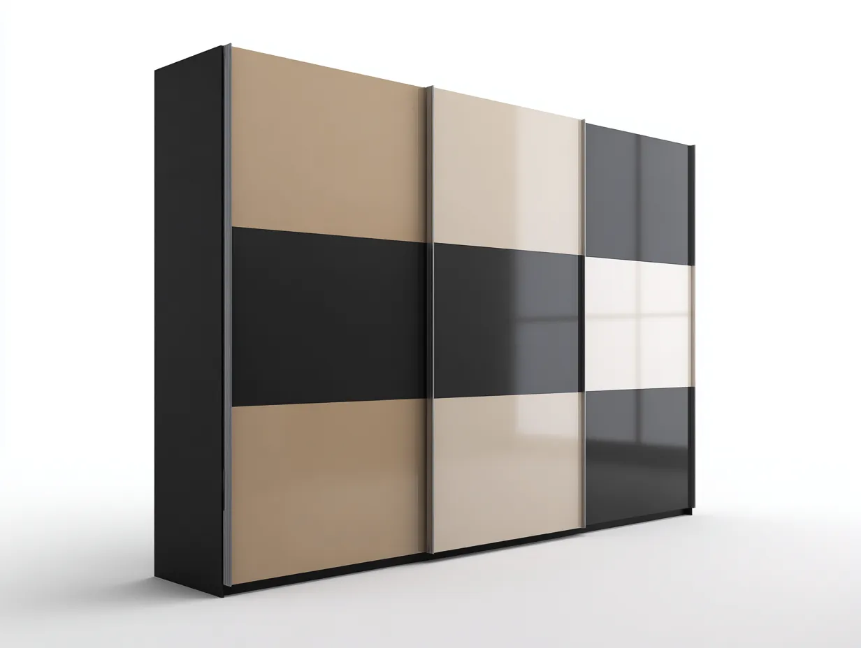 Amplio armario con tres puertas correderas en colores negro, beige y gris, diseñado para optimizar el espacio de almacenamiento en dormitorios y aportar un estilo moderno y elegante.
