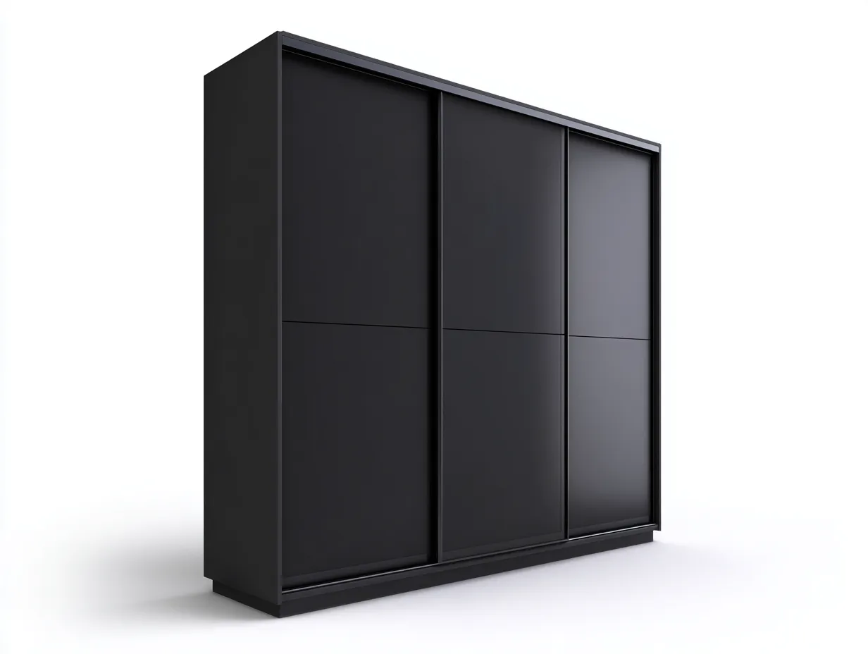Amplio armario negro con tres puertas correderas, diseñado para optimizar el almacenamiento en dormitorios y aportar un estilo moderno y elegante.