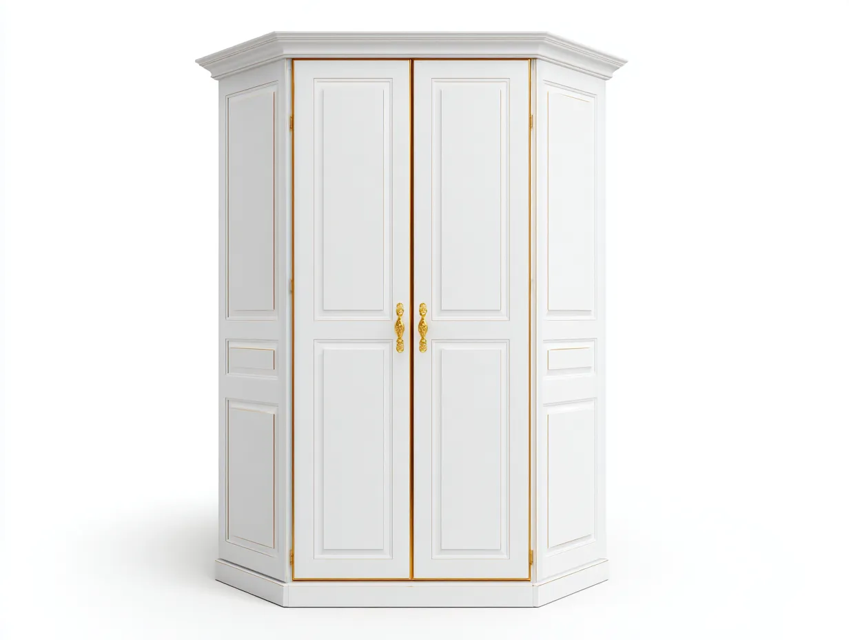 Armario esquinero de madera lacada en blanco con puertas batientes y tiradores metálicos dorados tallados, diseñado para optimizar el espacio de almacenamiento y aportar un estilo clásico y elegante a su hogar.