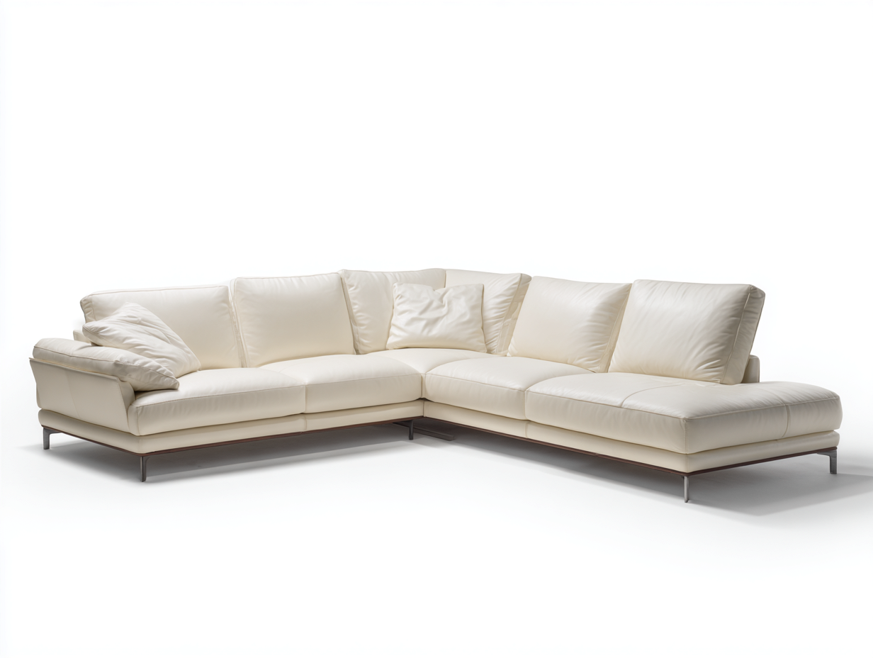 Sofá rinconero de cuero color crema claro con chaise lounge, diseño moderno y elegante para salas amplias y confortables.