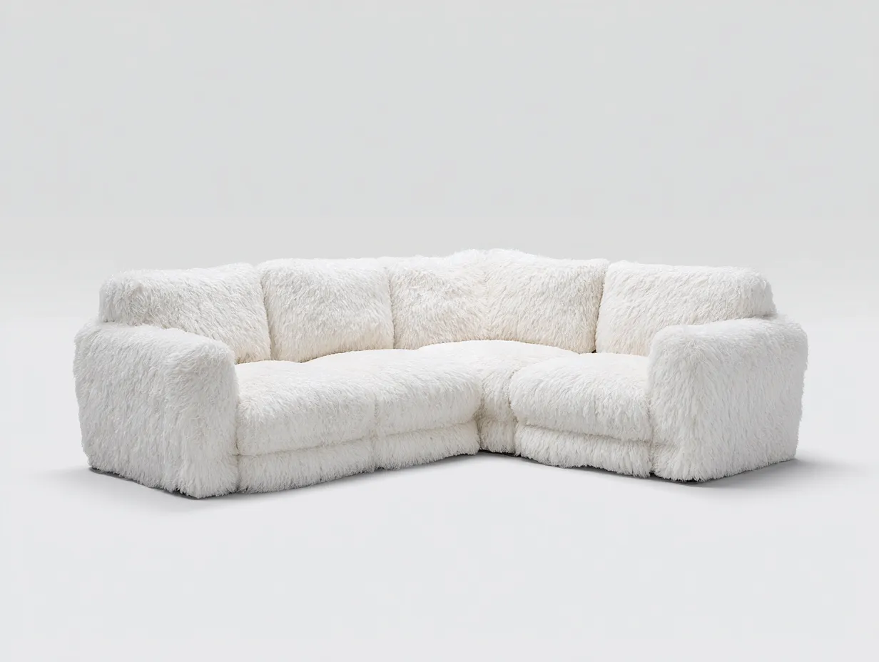 Sofá rinconero grande con diseño acogedor en tela de felpa color blanco, combina confort y estilo moderno, ideal para salas de estar espaciosas.